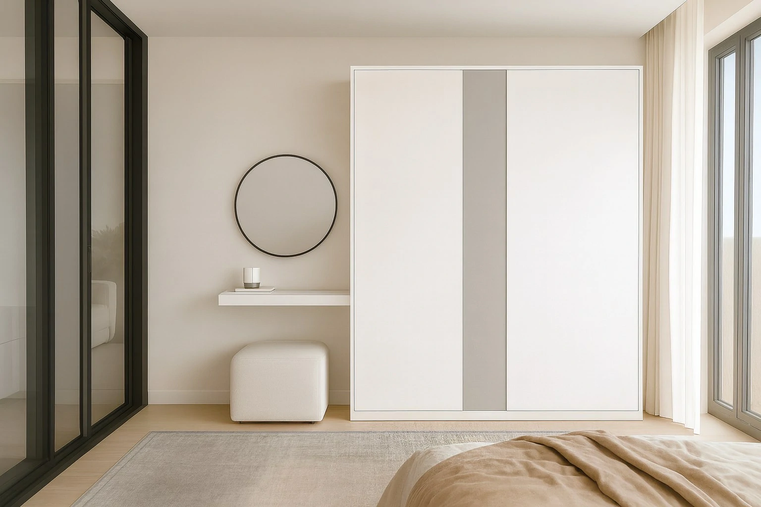 ห้องนอนสไตล์ Modern เน้นความเรียบง่ายและความสงบ เพื่อให้เป็นพื้นที่พักผ่อนที่แท้จริง เฟอร์นิเจอร์มักเป็นเตียงไม้หรือเหล็กดีไซน์เรียบ โต๊ะหัวเตียงแบบมินิมอล และตู้เสื้อผ้าแบบบิลต์อิน ที่ไม่เปลืองพื้นที่ สีที่ใช้มักเป็นโทน ขาว เทา ดำ ผสมกับงานไม้เพื่อเพิ่มความอบอุ่น พร้อมการจัดไฟ แบบซ่อนในผนังหรือหัวเตียง เพื่อสร้างบรรยากาศที่ผ่อนคลายและดูมีสไตล์